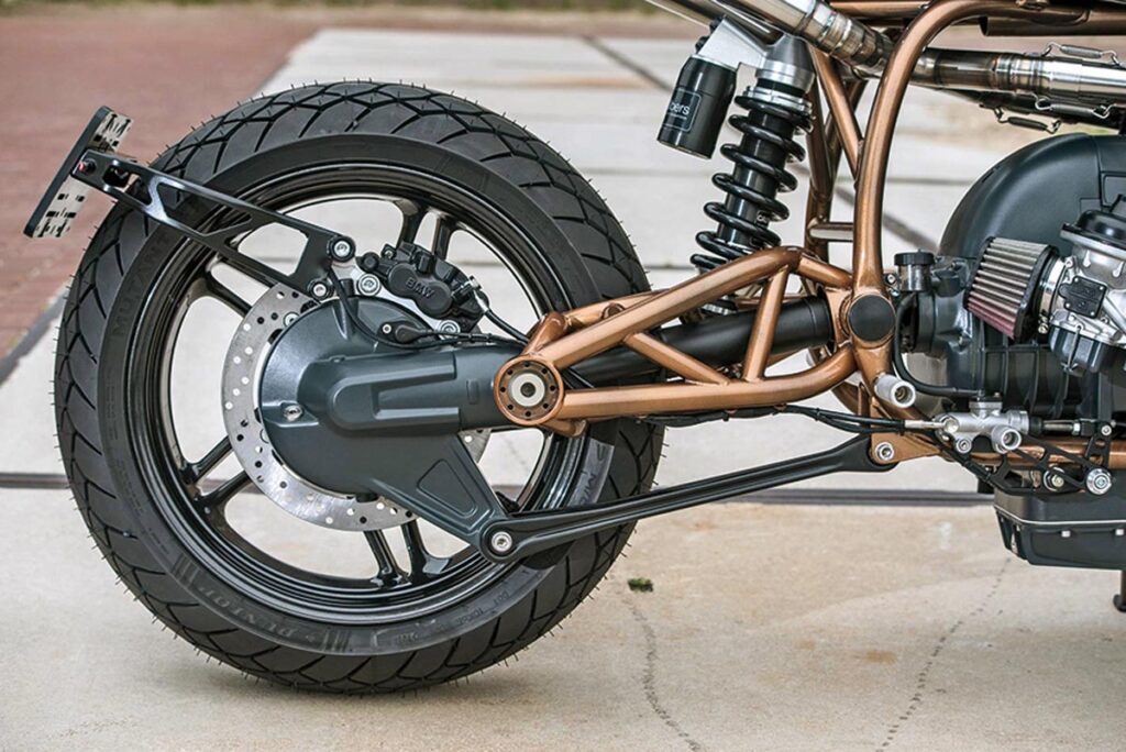 Como tuvo que rehacer prácticamente toda la parte ciclista desde cero, no se impuso límites y empezó diseñando una horquilla estilo Hossack para solucionar la suspensión delantera. Para la parte trasera, buscó una alternativa entre otros modelos de BMW que encajara con su proyecto, pero no encontró lo que buscaba y acabó teniendo que diseñar su propio chasis, con la idea de poder instalar un neumático más ancho y que el amortiguador estuviera centralizado (es un Wilbers, el mismo que el delantero).
