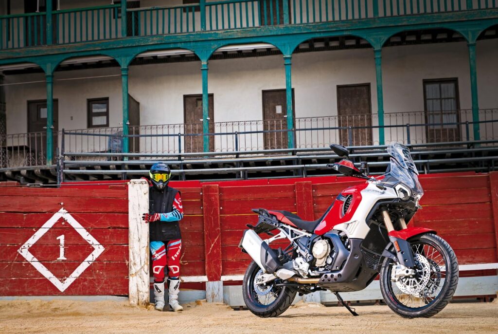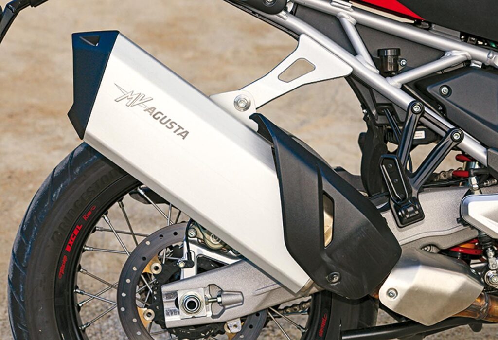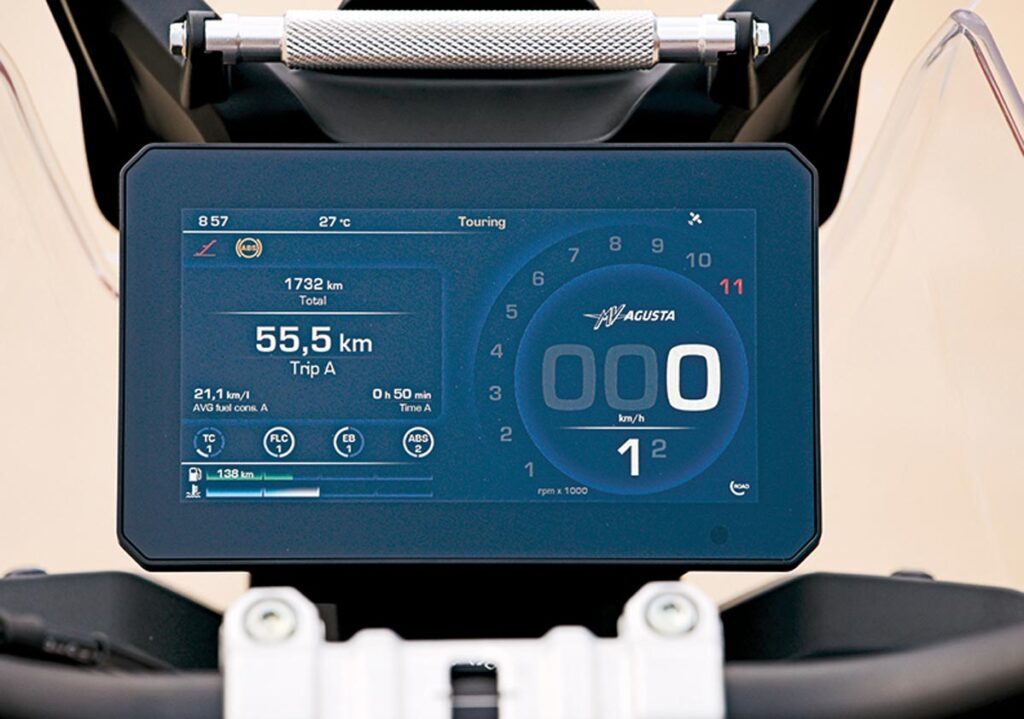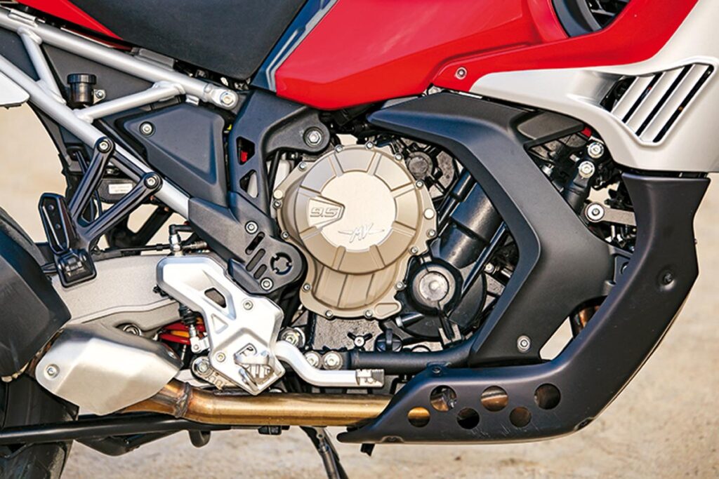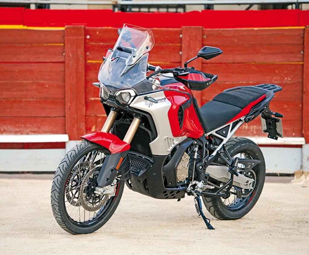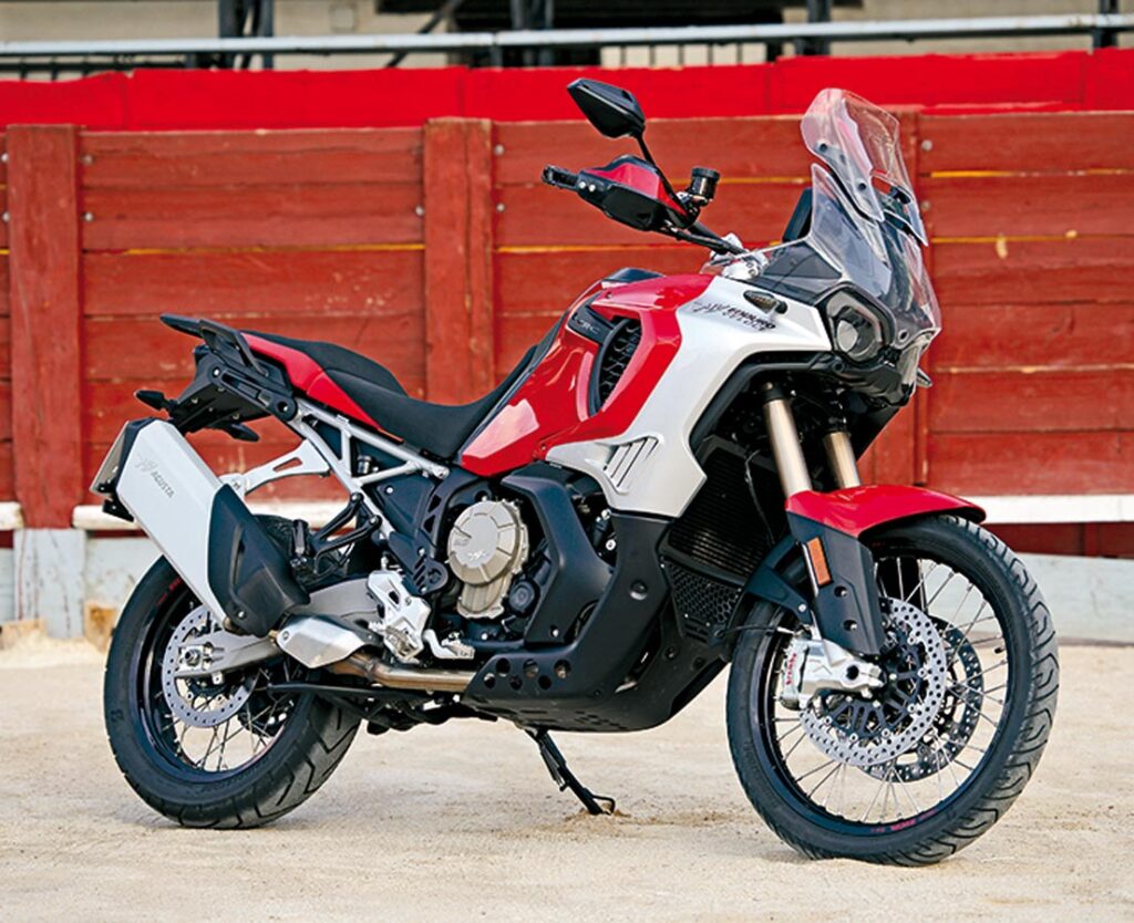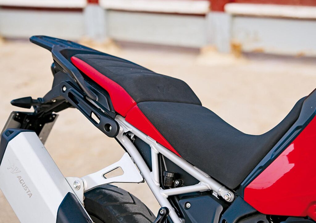 Enteramente diseñada y fabricada en Italia, la Enduro Veloce viste además la misma combinación rojo/plata que lucieron las míticas monturas de Giacomo Agostini en los tiempos de mayor gloria de la marca. A los pocos minutos de estar subido en ella, uno llega a pensar que sólo por el sonido ¬–“sonido italiano” diríamos– y el tacto del motor, su eventual adquisición ya casi merecería la pena. Genera unas sensaciones tan arrebatadoras, que no hace falta ser alguien demasiado sensible para verse irremediablemente sacudido por una intensa emoción. Imaginamos que quien se pone por vez primera a los mandos de un Ferrari experimentará algo parecido… El corazón de esta moto, tan vigoroso como compacto, cubica 931 cc, aun cuando su peso no va más allá de los 57 kg. La “magia” se encargan de producirla tres cilindros en línea con un cigüeñal contrarrotante, cuya acción, en teoría, incide de forma cilindrada y la MV los da a un régimen elevado (10.000 rpm), al tiempo que el 85 por ciento del par máximo queda a la entera disposición del piloto a partir de las 3.000 vueltas, todo lo cual propicia una respuesta motriz tan particular como adictiva. A ello hay que sumarle un cambio de marchas con asistencia electrónica que merece todos los elogios, tanto por su tacto suavísimo como por su exquisita precisión. Su funcionamiento roza la perfección y cuando haces uso del quickshifter sin tocar el embrague ni cortar gas al cambiar de marcha, el sonido y el feeling resultantes acaban por desmontarte todos los esquemas. Aquello es el nirvana, no hay palabras… Ofrece cuatro modos de conducción: Urban, Touring, Offroad –que desactiva, sin intervención alguna por parte del conductor, control de tracción y ABS trasero–, y Custom All- Terrain (enteramente confi gurable). El control de tracción ofrece ocho niveles diferentes de actuación, mientras que el ABS puede responder sin restricciones de ninguna clase o bien, de manera comedida en el tren delantero y manteniéndose inactivo en el trasero.
