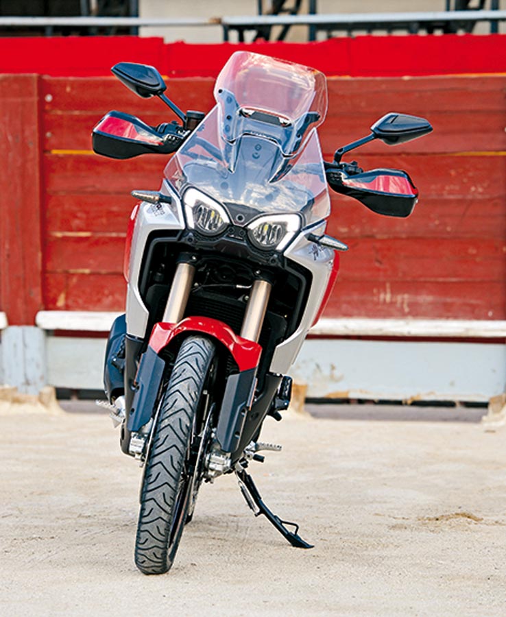 Nos lanzamos a carretera y enseguida constatamos que el parabrisas –sin regulación de altura– protege decentemente, aunque notamos un poco la fuerza del viento en el pecho. ¿Y prestaciones? Bueno, pues rodando por ejemplo a unos 190 km/h, algo que se consigue com sorprendente desahogo, se tiene la clara impresión de que aún queda mucho puño por girar y que los 220 de punta anunciados por el fabricante (y algunos más) son pan comido para esta fi era tan extraordinariamente dotada. Al meter la moto en las curvas, sí que notas que la llanta delantera es de 21 e inicialmente no la sientes tan manejable como las maxi-trail que emplean medidas inferiores. Pero una vez dentro, no hay mayor inconveniente, disfrutándose de un tacto que, sin pecar de excesiva rigidez, sí parece más firme que el de la típica trail blandita.
