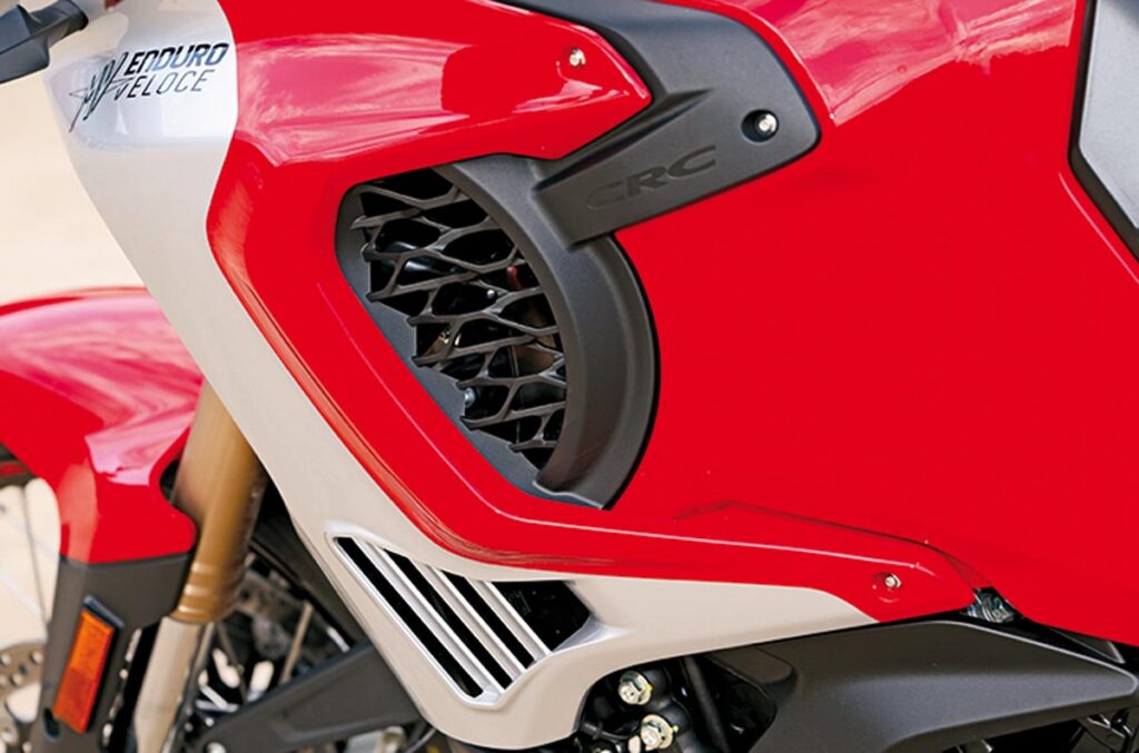 El control de tracción puede actuar con dos diferentes niveles de intervención, no mostrándose en ningún caso excesivamente intrusivo. Si no tienes las cosas muy claras al abandonar el asfalto, nosotros aconsejamos echar mano de él, por cuanto que la Enduro Veloce no es una moto fácil de conducir en campo, dada su forma de entregar la potencia, menos lineal que la que caracteriza a las bicilíndricas. Siempre se puede, claro, adoptar una cadencia tranquila, sin salir del bajo régimen y siendo consciente de que cuando llegas a la zona media, aquello se va a transformar, convirtiéndose en una montura muy exigente, que requiere manos experimentadas. A su favor, una posición de pilotaje equilibrada, que permite conducir erguido con naturalidad, aun cuando no disfrutes de la estrechez de modelos más “esbeltos” y con el inconveniente también de que si echas el cuerpo hacia atrás, la anchura del asiento te estorbará. De punteras, imposible pilotar; puesto que los soportes de los estribos del pasajero te lo impiden y el protector del escape molesta por el lado derecho. Siguiendo en el marco de la utilización off-road, conviene controlar bien los movimientos de tu mano derecha y mantenerla cercana a la posición de gas cerrado, dado que, cuando el motor alcanza el medio régimen, se dispara rabiosamente. Si pretendes conducir la moto con cierta alegría dejándola deslizar de atrás, también deberías evitar los golpes bruscos de acelerador y las subidas de vueltas exageradas, ya no sólo por las musculadas reacciones del propulsor, sino porque los neumáticos –Bridgestone Battlax Adventure A41R– no ayudan demasiado. La suspensión proporciona un tacto muy confortable en los rizados, apreciándose una respuesta quizá más seca ante obstáculos grandes y saltos, donde los kilos se dejan notar, aun cuando la suspensión tolera bastante bien los esfuerzos. En cualquier caso, para una utilización off-road moderada, la que con seguridad le darán la mayoría de posibles usuarios, sin hazañas que pudieran comprometer la integridad de un joya como ésta, el comportamiento tanto de horquilla como de amortiguador es más que satisfactorio.