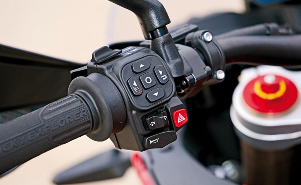 Nos gustan la pata de cabra (fácil de desplegar y con base ancha y el adecuado grado de inclinación); el sistema de bloqueo electrónico de la dirección, que opera hacia ambos lados; la excelente protección de los colectores de escape; y el control de crucero, que, además de formar parte de la dotación de serie, destaca por su funcionalidad –entre otras cosas, permite incrementar o disminuir la velocidad en segmentos de 5 km/h y proceder a su desactivación mediante el giro hacia delante del puño del acelerador–. Los puños, por cierto, están fenomenalmente realizados, lucen la inscripción Lucky Explorer, y su goma combina dos dibujos diferentes en aras de asegurar el máximo grip y confort. En cuanto a detalles que sí juzgamos susceptibles de mejora, citamos el reducido tamaño de la parrilla portabultos, la relativa lentitud del proceso de puesta en marcha, y el no excesivamente robusto material plástico empleado en los cubremanetas. Una completa información se ofrece en la pantalla TFT de 7”, que, además de poder ajustarse a tu gusto y ofrecer amplias posibilidades de conectividad, muestra unos colores y un diseño muy atractivos, en la línea de las pantallas de la nueva generación GS de BMW, aunque aquí algunos textos sí van pequeñitos y exigen vista de lince. En el propio mando del arranque, cosa curiosa, va incorporado el que te facilita el cambio de modos de conducción.