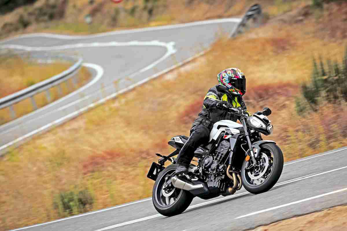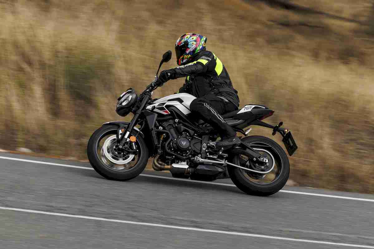 La parte ciclo es fabulosa. En carreteras bacheadas sientes claramente las irregularidades de la superficie, pero la suspensión no pierde el ritmo y la moto se mantiene agradable y controlada. Además, justo al principio de la prueba había tenido que echar mano de los frenos con algo de brusquedad, y la Triple frenó con contundencia y seguridad gracias a las pinzas radiales Brembo monobloque M4.32; no había hecho más que subir y no podía estar más satisfecho en esos primeros momentos sobre ella. Circulando a ritmo medio todo lo demás apenas se percibe, únicamente su fascinante motor de tres cilindros en línea. Puedes apreciar su vínculo com Moto2 cuando giras el puño de gas: parece haber potencia en todo el rango de revoluciones, y se ofrece de manera increíblemente suave y lineal. Este tricilíndrico es apasionante, incansable y en condiciones mixtas, gracias a las marchas más cortas, se muestra muy preparado y rápido. Esta es una de las “motos grandes” más fáciles de conducir, pero también es muy fácil hacerlo rápido, ya que no tienes que dedicar mucho tiempo hasta hacerte con ella. Bella cuando está parada, apasionante en movimiento, y estimulante cuando empieza a empujar, la Street Triple 765 A2 no defrauda las expectativas, más bien al contrario: eleva aún más el listón en su segmento. Tanto el conductor novel, que busque una buena y nueva montura, como el más experimentado, al que la estética, prestaciones y versatilidad le pesen más, encontrarán una opción perfecta en la Street Triple 765 A2.