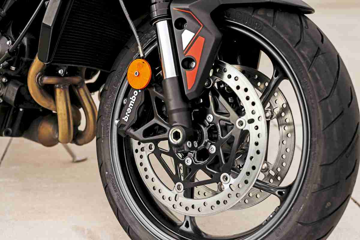El chasis de fundición de aluminio de doble viga otorga un comportamiento dinámico muy equilibrado al conjunto, algo que se debe en parte a la calidad de las suspensiones Showa ajustables en ambos trenes, aunque su tarado esté pensado para un uso más cívico de lo que la apariencia invita. La horquilla delantera invertida de 41 mm, es multirregulable y el amortiguador trasero permite también su ajuste en precarga, compresión y extensión del muelle. Gracias a la buena calidad de estos componentes, puedes alcanzar un buen rendimiento en ambos trenes si les buscas las cosquillas. Pero no te engañes; la diversión está mucho más cerca de lo que piensas y llevar al límite a la Street Triple 765 A2 es más complicado de lo que un piloto novel es capaz.