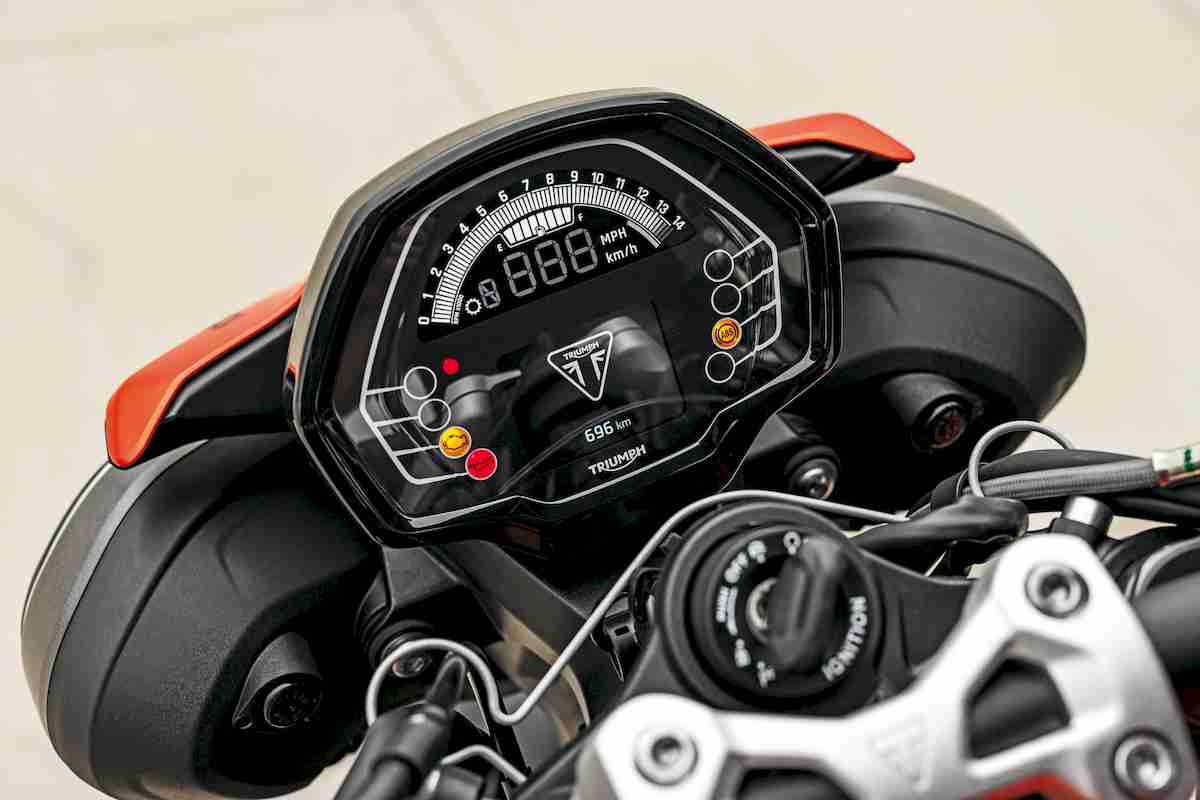 En su versión limitada ofrece los 47 CV exigidos por ley, frente a los 95 CV de su versión ‘libre’. Pero donde Triumph ha realizado un fantástico trabajo en la limitación de este propulsor es cuando se consultan la cifras de par. La versión “capada” rinde 61 Nm a 5.250 rpm, mientras que sin limitar la diferencia es tan solo 12 Nm más. Eso sí, en su versión libre, el par máximo se obtiene a 10.250 rpm, con lo que se consigue que el motor limitado sea muy aprovechable a bajo y medio régimen, cortando un poco la fogosidad en la estirada a altas vueltas. Pero más allá de estas cifras, esta versión limitada a A2 parece no estarlo. En el momento en que te subes, ya aprecias que no parece una moto limitada. La respuesta de su tricilíndrico impresiona, si lo que estás esperando es lo que ofrece una moto “censurada”. Su rendimiento en marcha, tanto en ciudad como en carretera abierta, hace palidecer a cualquier otra competidora del segmento: el ADN streetfighter queda perfectamente reflejado.