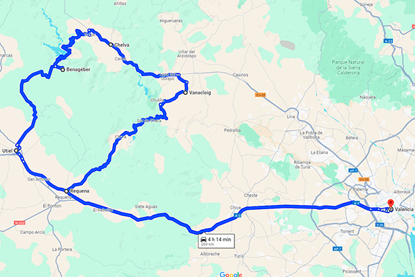 Saliendo de la ciudad de Valencia, la primera parte de esta ruta discurre por la A3 hasta llegar a Utiel, donde se toma la CV-390 que pasa por las localidades de Casas de Medina, Benagéber y Tuéjar. Ahí se accede a la CV-35, conocida como la autovía del Turia, en sentido a Valencia. Después de recorrer unos 30 km se llega hasta el desvío de la CV-396, situado antes de Losa del Obispo. Siguiendo esta carretera se accede a la conocida CV-395, una carretera con infinidad de curvas y buen asfalto que, tras atravesar Chera, nos lleva hasta Requena. Aquí se puede optar por coger la A3 de vuelta hasta la ciudad de Valencia o hacer unos kilómetros por la nacional antigua (N-III) que discurre cercana a la autovía y que pasa por la localidad de Siete Aguas.