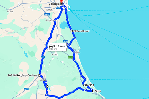 Valencia – Cullera– Parque Natural de la Marjal de Pego-Oliva – Cullera – Gandía Játiva – Valencia