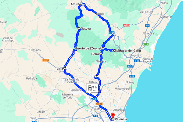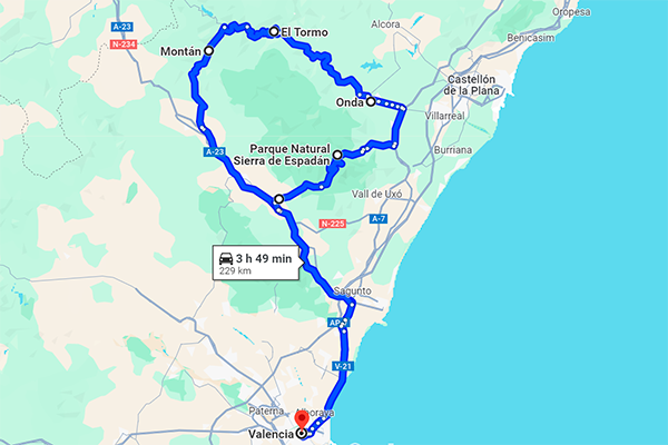 El itinerario comienza al norte de la capital valenciana y en su primer tramo discurre paralelo al mar por la V-21 con rumbo a la ciudad de Sagunto, punto en el que se debe tomar la A-23 hasta Jérica. Aquí la cosa cambia por completo y de una vía rápida se pasa a la CV-195, una carretera comarcal con infinidad de curvas que lleva hasta las localidades de Montán y Montanejos, dentro de la comarca del Alto Mijares. Si hace calor, la Fuente de los Baños de Montanejos de aguas termales es un lugar perfecto para refrescarse, aunque el acceso está controlado e incluso requiere adquirir una entrada. La Taberna de este municipio es un buen lugar para comer algo y reponer fuerzas antes de tomar la CV-20, una carretera comarcal aún más técnica que la anterior, cuyas características se adaptan perfectamente a motos de tipo trail. Tras pasar la localidad de Onda, la ruta gira a la derecha y tras unos kilómetros por la CV-10, prosigue por la CV-223 y la CV-219, dos carreteras serpenteantes que recorren el corazón del Parque Natural Sierra de Espadán. Estas llevan de nuevo a la A-23 y V-21 de vuelta a Valencia.