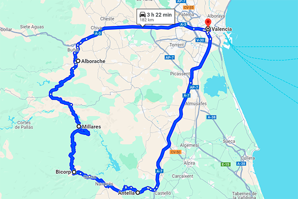 Una ruta quizás menos popular que otras de las que se pueden realizar dentro de la provincia de Valencia, pero ese es otro de sus alicientes, porque en algunos de sus tramos se circula sin coincidir apenas con otros vehículos. Sale de Valencia en sentido sur por la A7 hasta Alberique y regresa por la A3 desde Buñol, y entre ambas localidades discurre por carreteras comarcales muy variadas y con mucho encanto. Poco después de sobrepasar Alberique, se desvía por las CV-557, CV-560 y CV-580, pasando por Bicorp hasta llegar a Millares.
