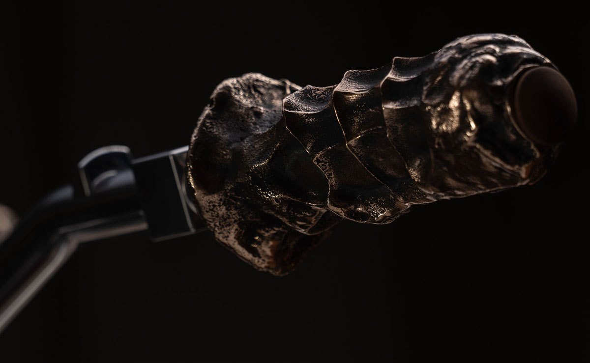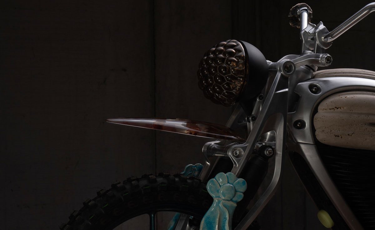 Los faros LED delanteros y traseros ahora están adornados con esculturas de vidrio soplado a mano. Aunque se mantiene la estructura de aluminio forjado, el revestimiento del falso tanque es de travertino, una piedra con una textura única. Los guardabarros están realizados a partir de láminas fundidas en resina transparente, la suspensión delantera está adornada con elementos de arcilla modelados a mano, al igual que los protectores de la correa, mientras que el sillín está tallado en nogal macizo. El compartimento de la batería de magnesio también se ha conservado, pero con el añadido de una cubierta de piedra negra alineada con las aletas de enfriamiento.
