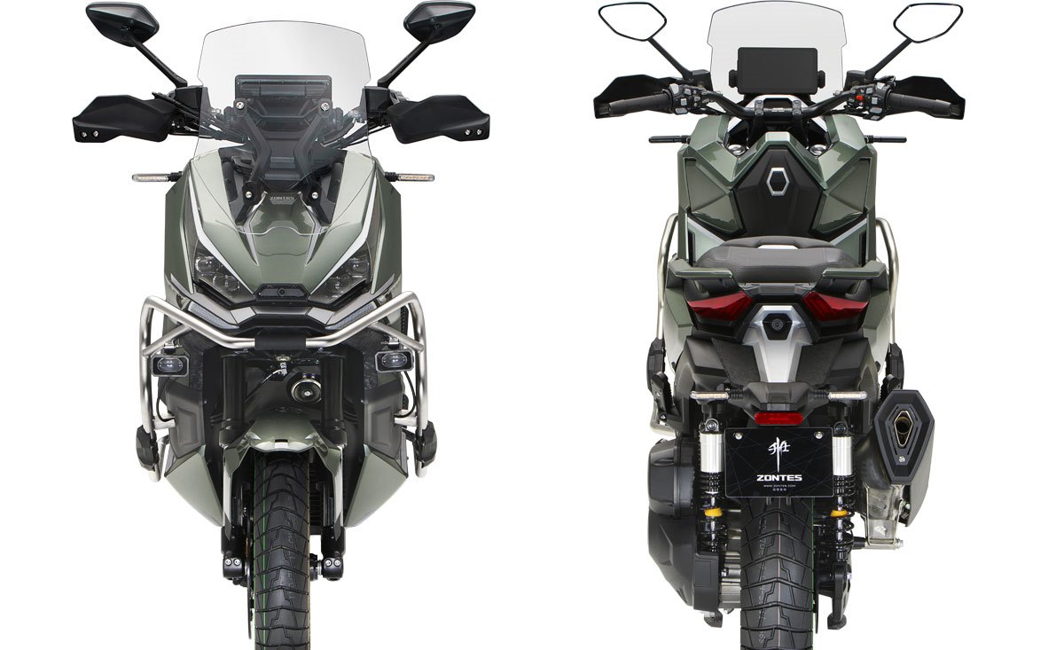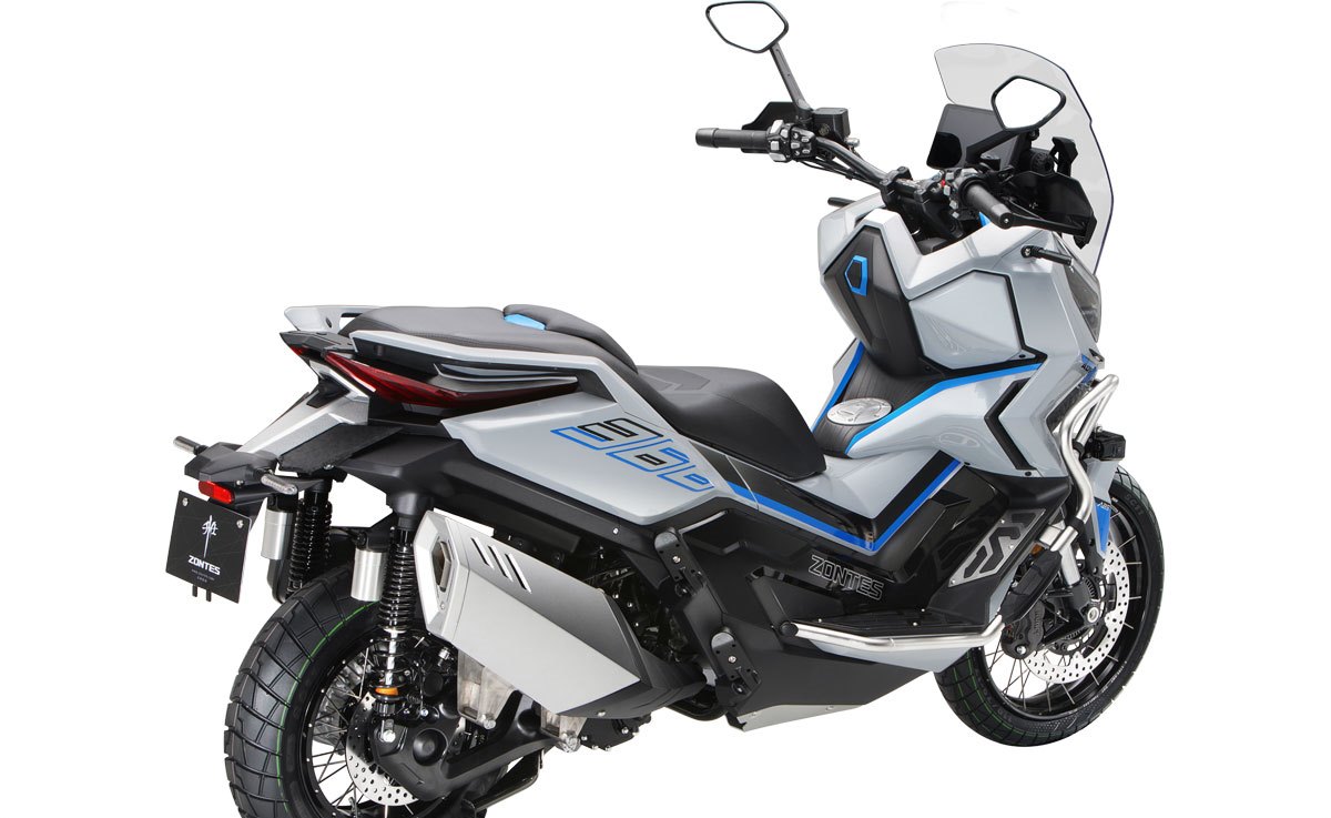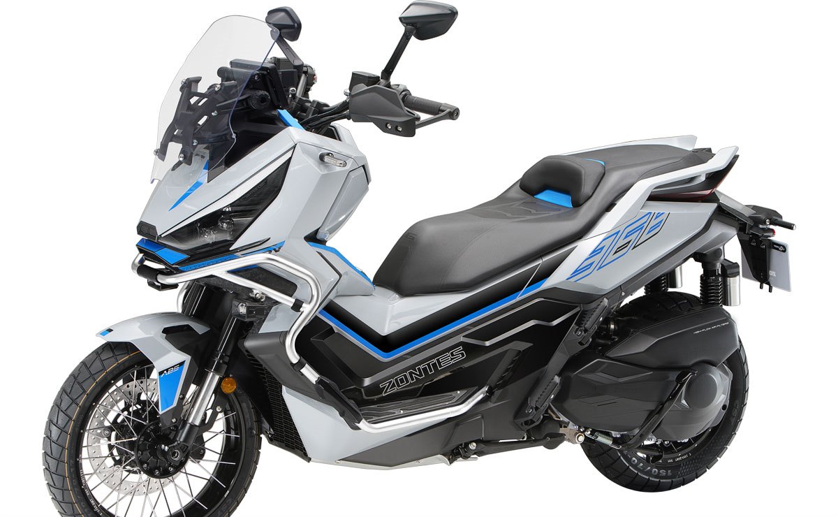 El maxi-scooter Zontes también es moderno y tecnológico con su iluminación full LED y su gran panel TFT a color de 8 pulgadas. Además, está equipado con arranque sin llave, sensor de presión y temperatura de neumáticos, cámaras de tablero delanteras y traseras, freno de estacionamiento, faros adicionales, puertos USB A y C, así como un maletero con capacidad para dos cascos y un tanque de combustible de 17.5 litros.