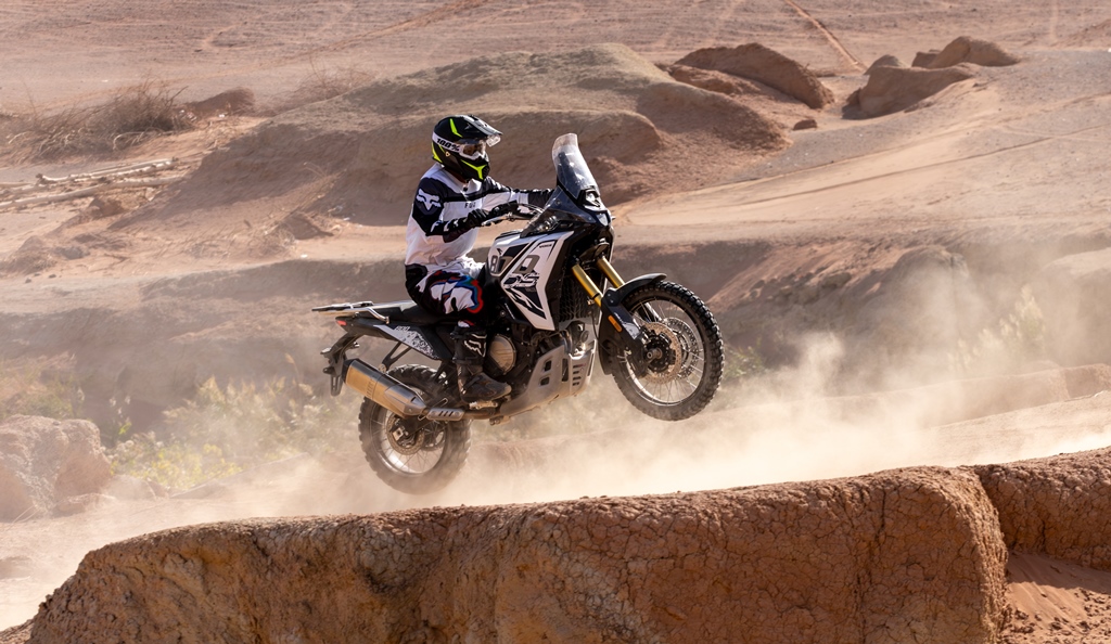 Uno de los puntos fuertes de la 800DS Rally es su parte ciclo, optimizada en todos sus componentes para ofrecer un rendimiento excelente tanto en carretera como fuera de ella. Sus neumáticos tubeless en medidas: 21″ delante y 18″ detrás, son una elección técnica que mejora su rendimiento en todo tipo de terrenos. La llanta delantera proporciona mayor estabilidad direccional y mejor capacidad para superar obstáculos, mientras que la trasera garantiza una mayor superficie de contacto, optimizando la tracción. Ambas llantas, de tipo tangencial y sin cámara, están calzadas con neumáticos Pirelli Scorpion Rally STR, reconocidos por su versatilidad en motos Trail. Las suspensiones KYB (Kayaba), completamente regulables, incluyen una horquilla invertida y un monoamortiguador trasero con depósito separado y montado sobre bieletas, que ofrecen recorridos adecuados para enfrentar todo tipo de obstáculos con seguridad. La altura libre al suelo de 220 mm y la incorporación de un amortiguador de dirección regulable de tipo rotativo permiten mantener la estabilidad del tren delantero incluso en las condiciones más complicadas. El sistema de frenado está compuesto por un doble disco delantero con pinzas radiales de cuatro pistones y un disco trasero de grandes dimensiones, todo firmado por Nissin. El conjunto se complementa con un sistema ABS desconectable de última generación para su uso en off-road. El chasis, fabricado en acero de alta resistencia, ha sido optimizado para ofrecer el equilibrio ideal entre rigidez y flexibilidad, y cuenta con un basculante de aluminio que ayuda a reducir el peso total, situándose en 210 kg sin gasolina.
