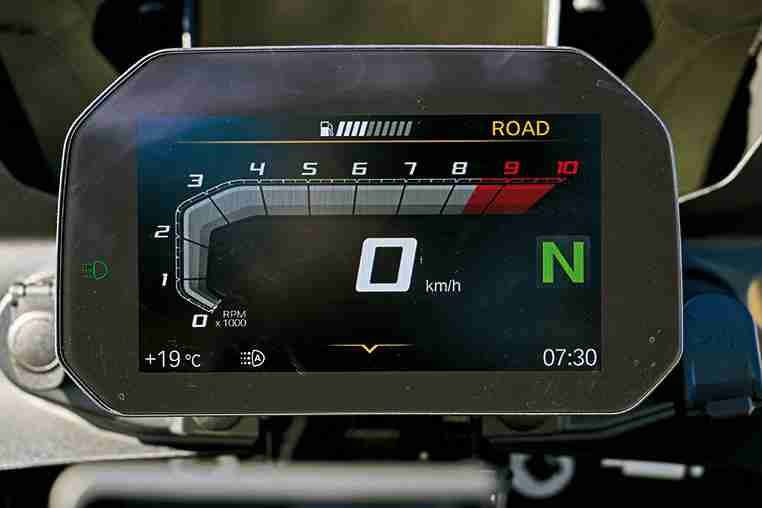 Los tres modelos vienen armados en origen con sólo dos modos de conducción, Road y Rain. ¡Qué triste! ¿Verdad? Al seleccionar el primero de ellos, constatas que también en la 800 brinda una respuesta fluida y alegre. Sube muy bien de vueltas, con notable elasticidad, aunque se aprecia, claro, que la entrega de par resulta más discreta, sin que tampoco haga acto de presencia ese pico de explosividad que sí presentan sus hermanas cuando das gas sin contemplaciones. La moto es muy cómoda, más estrecha y también más bajita de asiento –815 mm frente a los 870 de la GS 900–, sintiéndose más manejable en curva y requiriendo menos esfuerzo por parte del piloto. Su sobresaliente estabilidad hace que enseguida te confíes y te apliques, no debiéndose insistir mucho para llegar a rozar con el pie en el suelo. En campo también permite adoptar una postura natural, sin estorbos ni de pie ni sentado, pudiendo jugar libremente con la colocación de tus pies y sin tampoco necesidad de abrir mucho las piernas, dada la reducida anchura del depósito, especialmente, en su mitad posterior.