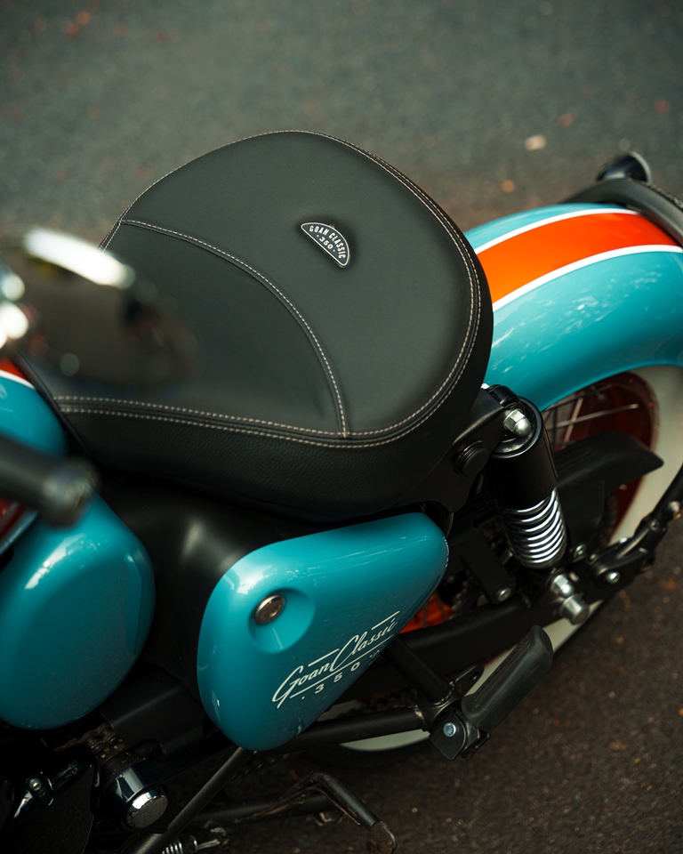 Construida sobre un chasis de tubo diagonal de doble cuna, la motocicleta ofrece una conducción suave y estable en todo tipo de carreteras. La suspensión delantera telescópica con horquilla de 41 mm y amortiguadores traseros garantiza el equilibrio perfecto entre comodidad y control. Las llantas de aluminio de 19 pulgadas (delanteras) y 16 pulgadas (traseras) con radios cruzados y neumáticos tubeless de banda blanca proporcionan un excelente agarre, mientras que el ABS de doble canal con frenos de disco de 300 mm (delanteros) y 270 mm (traseros) proporciona una mayor potencia de frenado. La posición de conducción relajada, los pedales centralizados y el manillar ergonómico hacen que los viajes largos sean cómodos y agradables, perfectos para quienes disfrutan tanto del trayecto como del destino. La Goan Classic 350 incluye un asiento de pasajero fácil de atornillar, que permite cambiar entre configuraciones monoplaza y biplaza.