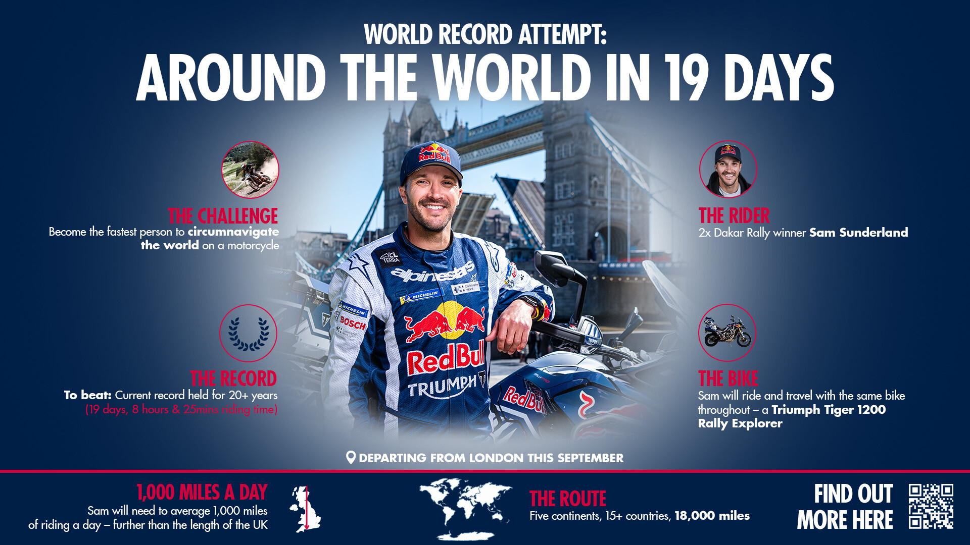 Sam partirá de Londres en su Triumph 1200 Rally Explorer en septiembre. El desafío es una prueba de fuerza física y mental, en la que Sam se enfrentará a las inclemencias del tiempo, las condiciones de la carretera y terrenos desconocidos. Recorrerá más de 15 países en los cinco continentes, comenzando y terminando su viaje en Londres. Al hablar del proyecto como atleta, campeón, padre y aventurero, Sam enfatiza su deseo de crear un legado que vaya más allá de las carreras todoterreno, con el objetivo de inspirar a personas de todo el mundo a aventurarse, superar sus límites y redefinir lo que creen posible. «Sé que este desafío me pondrá a prueba profundamente, tanto física como mentalmente», dijo Sam Sunderland. La etapa de las victorias anteriores de Sam, el Rally Dakar, es conocida como la carrera más dura del mundo. Es mayoritariamente todoterreno, con una distancia total de unos 8.000 km. Se tarda entre 10 y 15 días en completarla, y los competidores recorren entre 480 y 900 km al día.